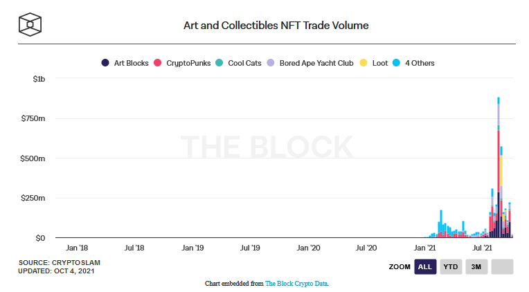 The NFT industry has exploded in popularity this year. There was more than $2.5 billion in sales volume during the first half of 2021, and it has only accelerated since then, with the top 10 projects generating $1.3B in sales volume over the past month alone. At the time of this writing, four projects have recorded sales in excess of $100M over the past month, with Axie Infinity leading the way, generating $505M in sales over that period. OpenSea, the most popular NFT marketplace, saw more than $3 billion in NFT sales volume during the month of August alone.